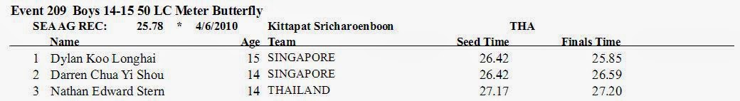 Desmond Ng and Sebastian Soon each managed a silver in 200m breaststoke and 200m butterfly respectively, while Keith Lim settled for a bronze in the 100m butterfly event.